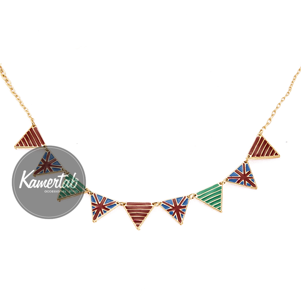 Выполнена из сплава металлов в соединении с глазурью. Длина части с треугольниками - 17.5 см, общая длина с цепочкой 34-38 см.